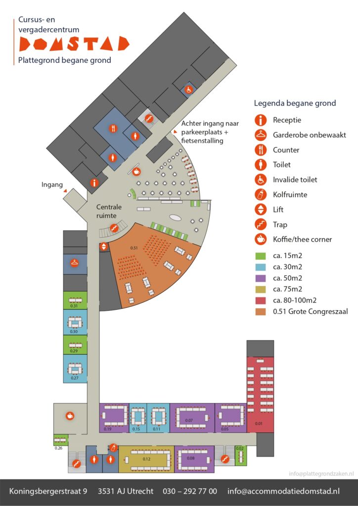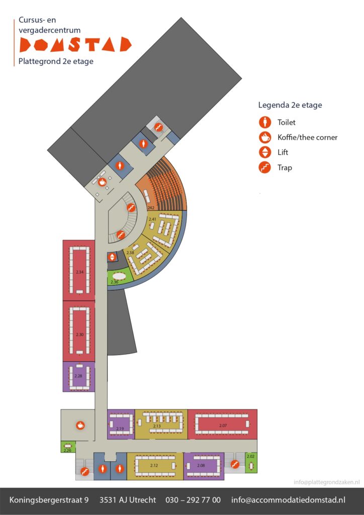 Hieronder vind je de plattegronden van de begaande grond, eerste verdieping en tweede verdieping. Het plenaire gedeelte vindt plaats op de begaande grond, de sessies op de eerste en tweede verdieping.