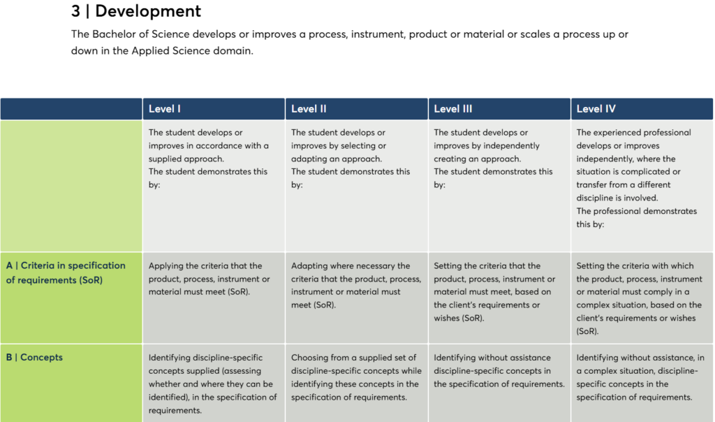 The levels that students reach at the end of their studies vary per programme. The intermediate stages on the road to that end level are evaluated on the basis of what are known as action indicatorsInstrument om competenties concretiseerbaar te maken; een student laat zien dat hij over een specifieke competentie beschikt door op een bepaalde manier te handelen., which are formulated in a way that enables them to visualise a development trajectoryOm een voorbeeld te geven: wanneer een student onderzoek uitvoert en blijkt dat de manier van samenwerken een goed resultaat in de weg staat, krijgt de student daar feedback over en kan daarmee in een vervolgonderzoek gericht aan de slag gaan. Ook kan een student gevraagd worden om tijdens de uitvoering van een experiment extra aandacht te besteden aan een goed labjournaal. En een ouderejaarsstudent kan bijvoorbeeld aan de competentie ‘instrueren’ werken door eerstejaarsstudenten te begeleiden met praktijkproeven. in a concrete way. As such, they are also suitable for providing feedback to students when they are doing research or carrying out an experiment.
