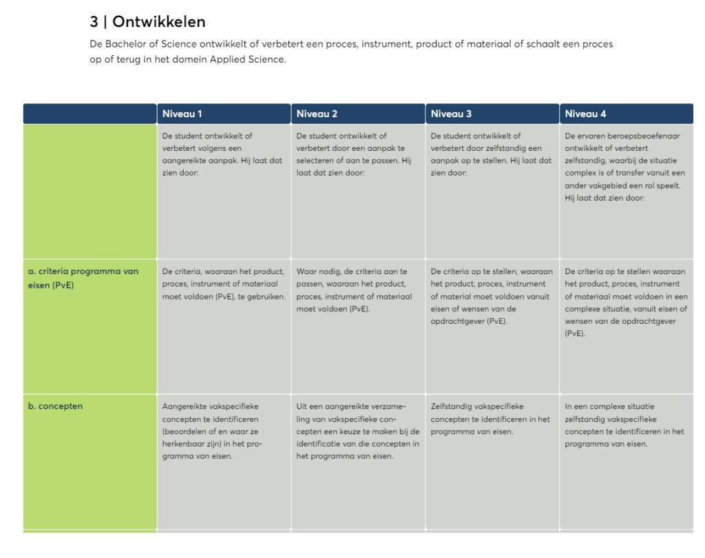 *Let op: De competentie Projectmatig werken is in september 2023 nieuw toegevoegd aan de competentieset van het Domein Applied Science. Projectmatig werken vervangt de competentie Leidinggeven | Managen. Gedurende het proces van de implementatie van Projectmatig werken in de opleidingen, blijven beide competentietabellen beschikbaar in de profielbeschrijving.